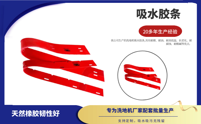 產(chǎn)品說明:吸水膠條是洗地機吸水扒上的重要部件,作用就是與地面接觸,產(chǎn)生一個密封的空間,把地面上的污水通過風機進行回收。吸水膠條一般分為耐油型(進口PU原料)和普通型(進口NR原料)兩種。